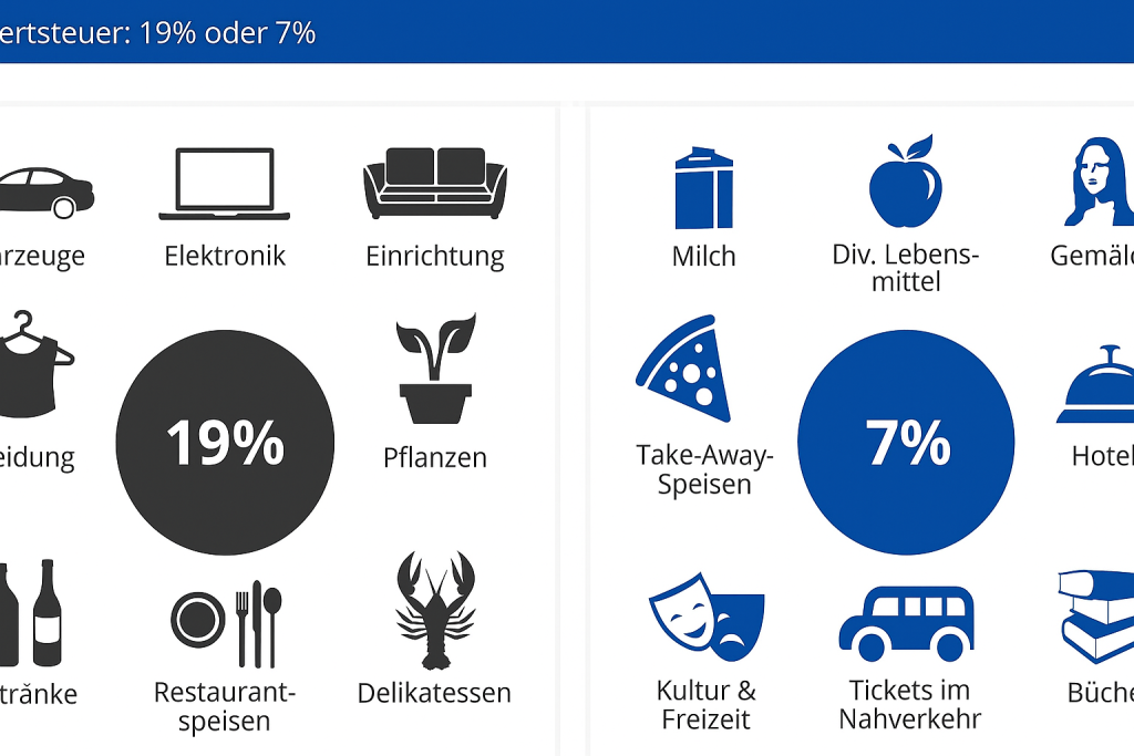 In Deutschland ist die Mehrwertsteuer (MwSt) die wichtigste Form der Verbrauchssteuer. Sie wird auf jeder Stufe der Lieferkette erhoben, wenn Waren oder Dienstleistungen einen Mehrwert erhalten. Unternehmen erheben die Mehrwertsteuer von ihren Kunden (Ausgangssteuer) und können die auf geschäftsbezogene Einkäufe gezahlte Mehrwertsteuer (Vorsteuer) abziehen, sodass sie nur die Differenz an das Finanzamt zahlen. Der reguläre Mehrwertsteuersatz beträgt 19 %, während für bestimmte Güter und Dienstleistungen wie Lebensmittel, Bücher und den öffentlichen Nahverkehr ein ermäßigter Satz von 7 % gilt.